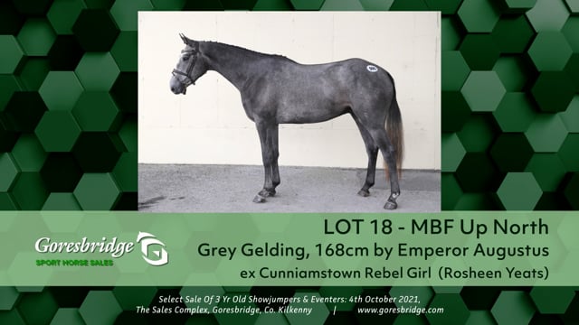 MBF UP NORTH reg. grey geld 3 yrs. about 16.2h. by EMPEROR AUGUSTUS dam CUNNIAMSTOWN REBEL by ROSHEEN YEATS. Breeding Recorded.