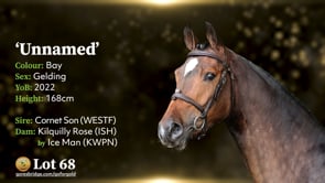 Bay geld. 3 yrs. about 16.2h. by CORNET SON dam KILQUILLY ROSIE by ICE MAN. Breeding Recorded.
