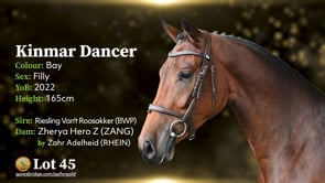 KINMAR DANCER bay filly 3 yrs. about 1.65m by RIESLING VAN'T ROOSAKKER dam ZHERYA HERO Z by ZAHR ADELHEID. Breeding Recorded.