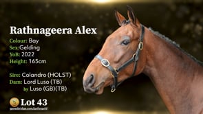 RATHNAGEERA ALEX bay geld. 3 yrs. about 16.1h. by COLANDRO dam LORD LUSO by LUSO. Breeding Recorded.